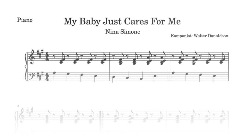 Im Notenbeispiel findet man Simones eigenwillige Piano-Begleitung von My Baby Just Cares for Me mit dem einprägsamen Intro. Es besteht aus einem Walking-Bass (den man übrigens auch als Improvisationsgrundlage nutzen kann) und durchgehend mit der rechten Hand im Off-gespielten Akkorden. Notiert ist die Begleitung wie üblich in geraden 8tel-Noten, sie wird aber leicht swingend gespielt. Das Tempo liegt bei ca. 120 BPM.