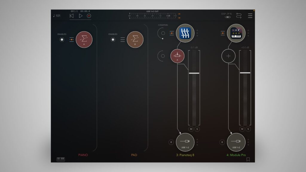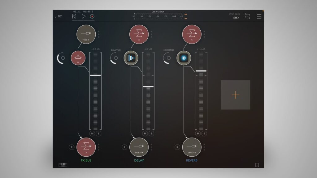 Kymatica AUM macht iOS-Geräte zu einer Audio Workstation, die Live-Anwendungen die erforderliche Flexibilität bieten kann. Die freien Routing-Möglichkeiten und das Bus-System machen eigentlich alles möglich.