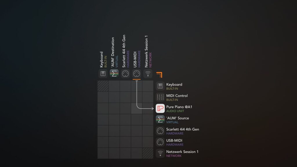 AUM ist extrem flexibel und erlaubt selbst komplexe Audio-und MIDI-Routings, wobei das Bus-System eine große Hilfe sein kann. Auch MIDI-seitig ist das Kombinieren über MIDI-Busse sehr praktisch und macht AUM zu einer sehr flexiblen Masterkeyboard-App.
