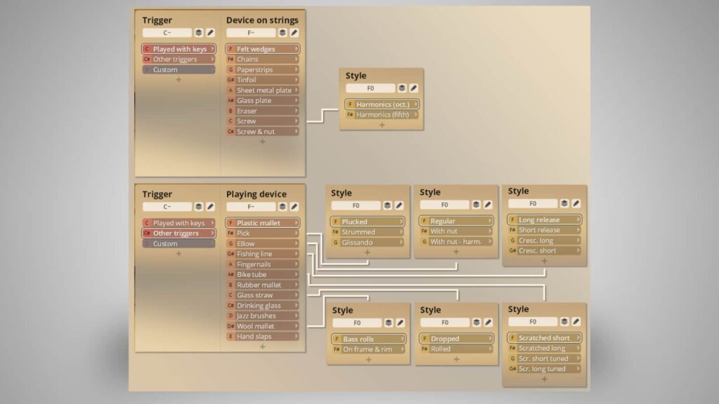 Nicht weniger als 21 unterschiedliche Prepared-Piano-Kategorien bilden den Kern der Library. Manche teilen sich sogar noch in weitere Unterkategorien auf.